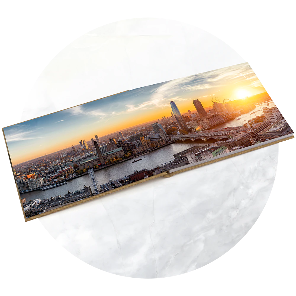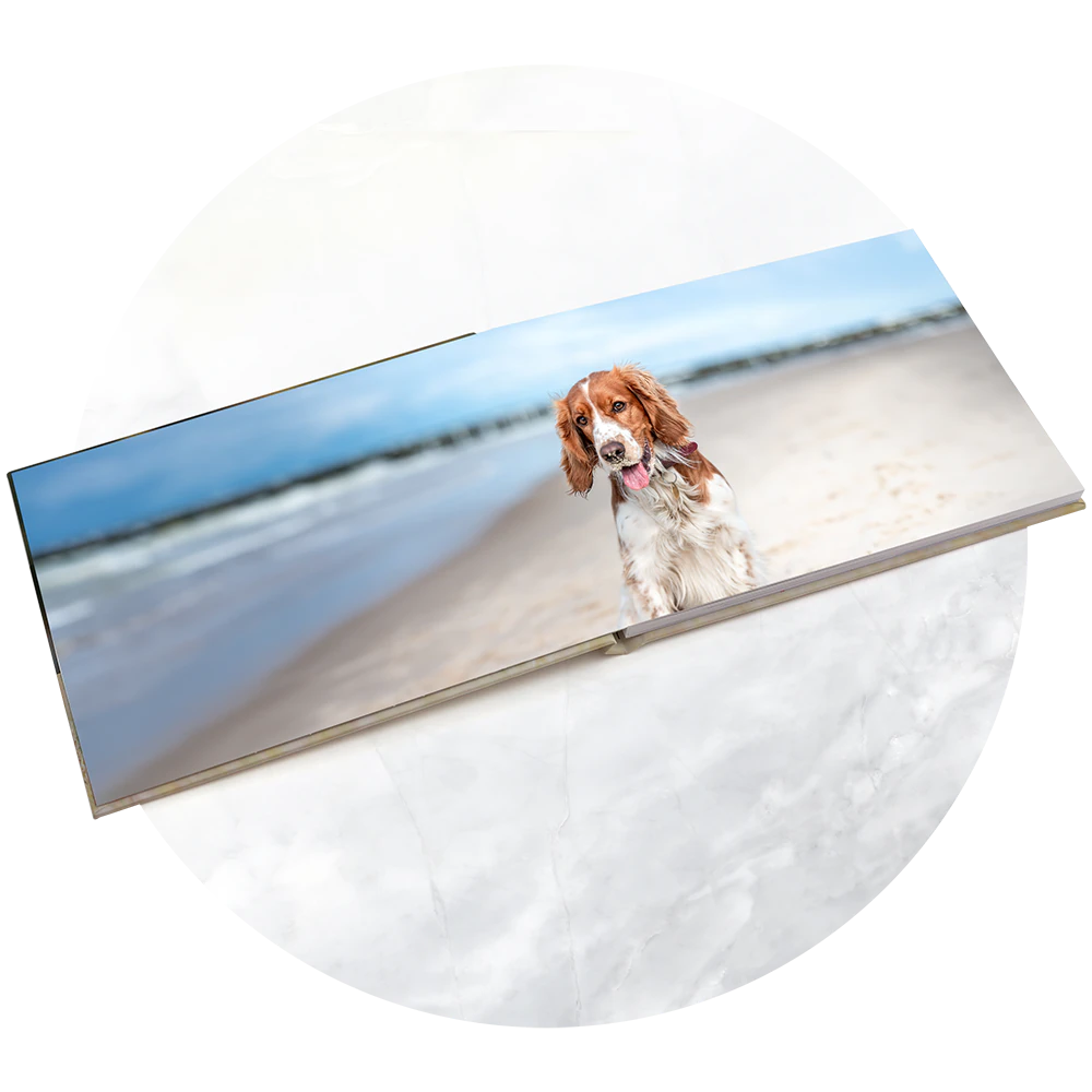 Bei einem Lay-Flat-Fotobuch lassen sich die Seiten komplett flach aufschlagen, was ideal für Panoramabilder oder nahtlose Doppelseiten ist. Es ist eine beliebte Wahl für Hochzeitsalben und Landschaftsfotografie.