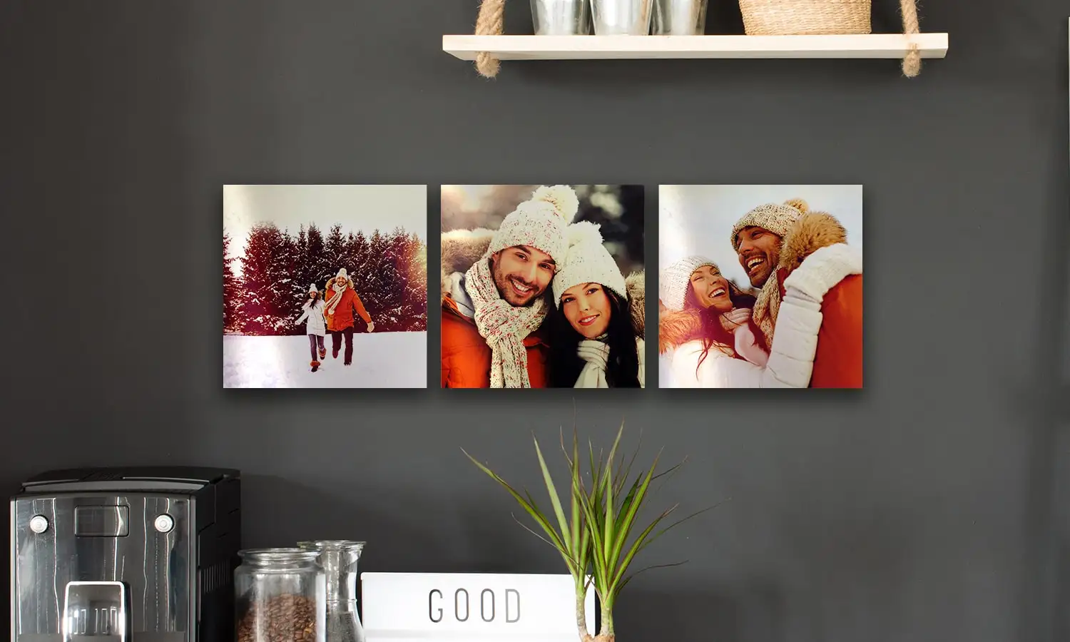 Hängen Sie Ihr 3-teiliges Metallbild über das Sofa oder in die Küche. Für einen sauberen Look lassen Sie einen Abstand von 2 cm zwischen den einzelnen Teilen.