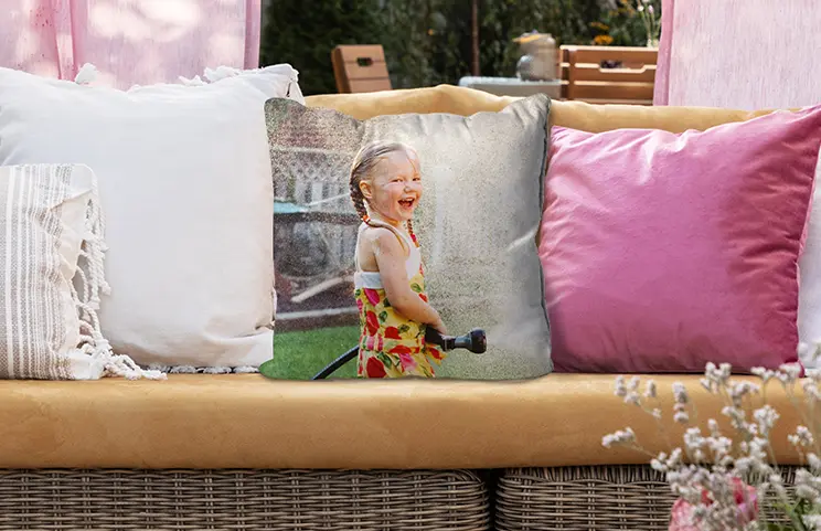 • Außenbereiche: Beleben Sie Ihre Gartenmöbel mit wetterfesten, personalisierten Kissenbezügen mit floralen Mustern oder malerischen Naturdrucken.
