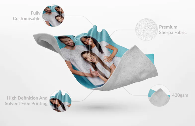 Zeigen Sie mehr Erinnerungen mit doppelseitigem Druck. Verfügbar für Fleece- und Plüsch-Fleece-Decken.